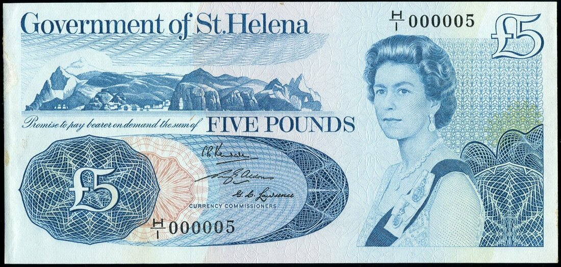 Government of St. Helena, £5, 1979, serial number H/1 000005, (Pick 7, TBB B303a), previously mounted at left boarder, mounting traces, with ANGLAE error, otherwise very presentable about uncirculated