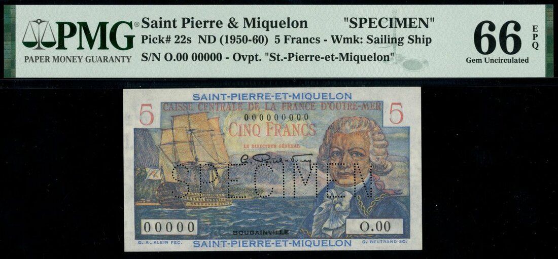 Saint Pierre et Miquelon, specimen 5 francs, ND (1950-), serial number O.00 blue, brown, green, orange, and yellow, caravelle at anchor along tree-lined shore with mountains in background, navigator Louis Antoine de Bougainville, reverse palm, trees, native woman wearing headscarf