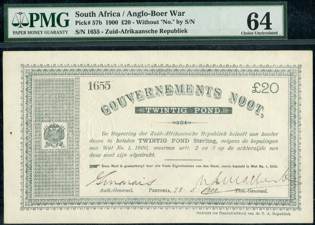 (x) Gouvernments Noot, South Africa, £20, 1900, serial number 1655, (Pick 57b), in PMG holder 64 Choice Uncirculated, only 1 in high grade on PMG Population Report