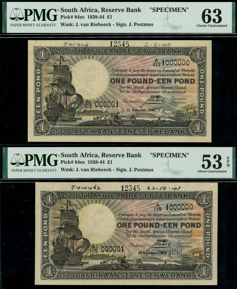 South African Reserve Bank, printer's archival specimen £1 (2), 1940, 1941, prefixes A/103 and A/115, both Postmus signature, black on pale pink, orange and blue underprint, galleon at left, allegorical scenes at lower centre and lower right, reverse coat of arms at centre, both perforated SPECIMEN