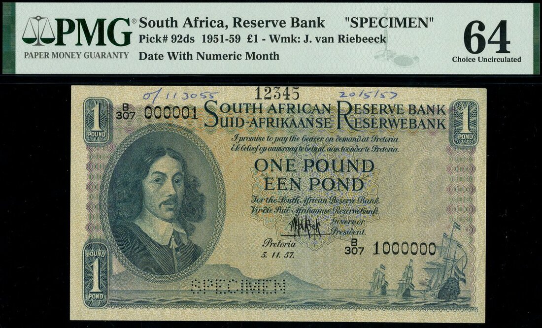 South African Reserve Bank, printer's archival specimen 1 pond, 5th October 1957, serial numbers A/125, A/161 000001 - 1000000, blue, portrait of Jan van Riebeeck at left, first line of bank name and value in English, signature DR. M. H. de Kock, reverse, lion and banner form coat of arms,