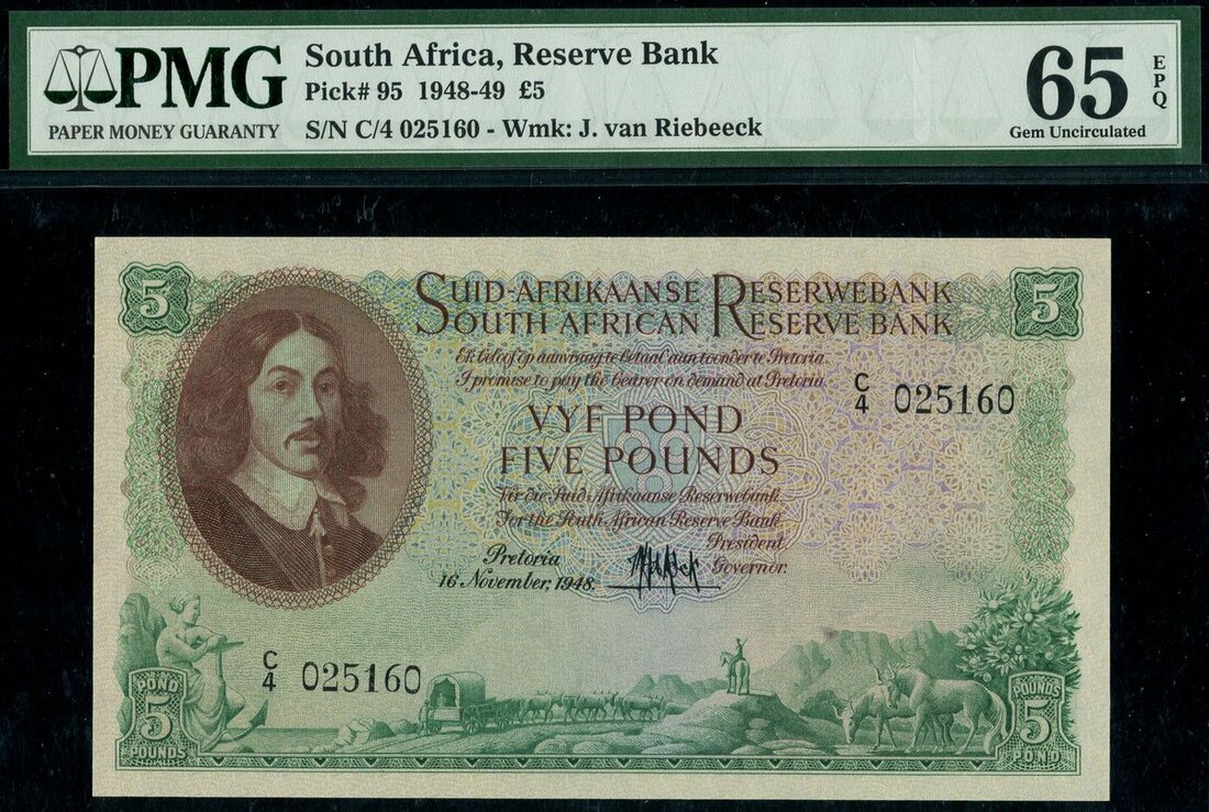 (x) South African Reserve Bank, 5 rand, ND (1948-49), serial number C/4 025160, (Pick 95), in PMG holder 65 EPQ Gem Uncirculated
