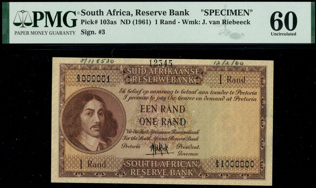 (Pick 103s, TBB B31s), different order of Afrikaans and English to the previous issue, in PMG holder 60 Uncirculated
