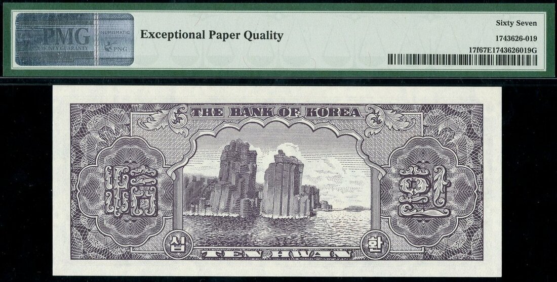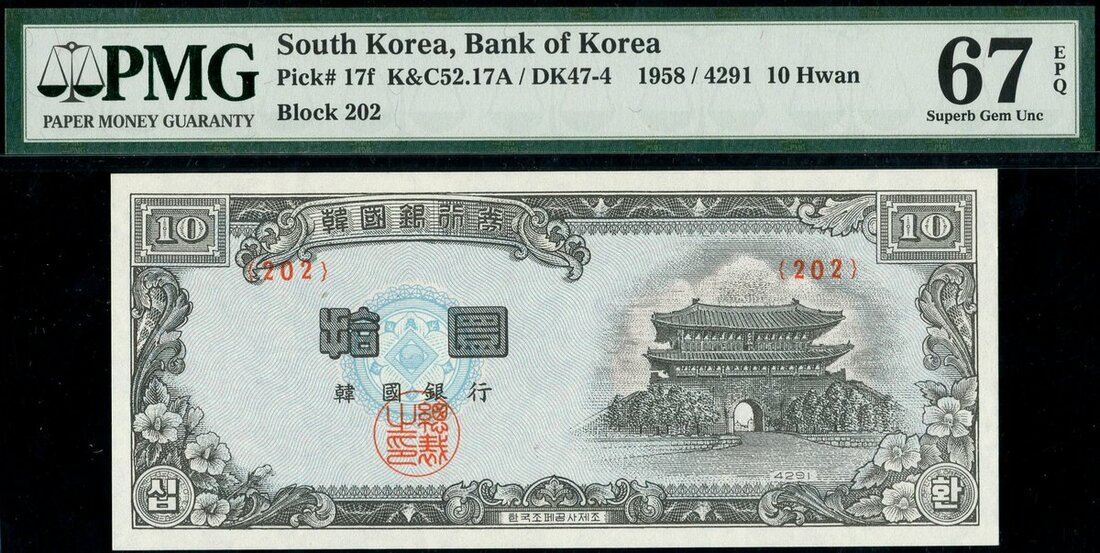 (x) Bank of Korea, South Korea, 10 hwan, 1958, block 202, (Pick 17f), in PMG holder 67 EPQ Superb Gem Unc, top grade on PMG