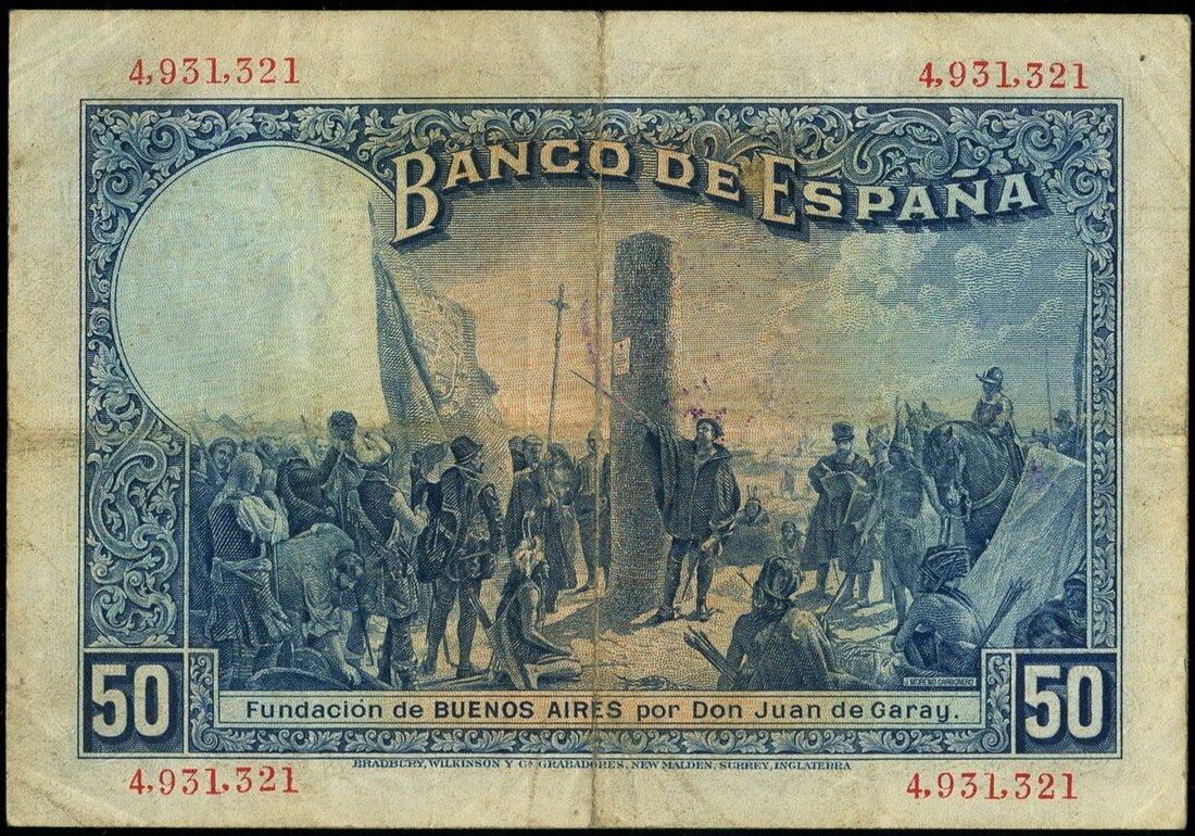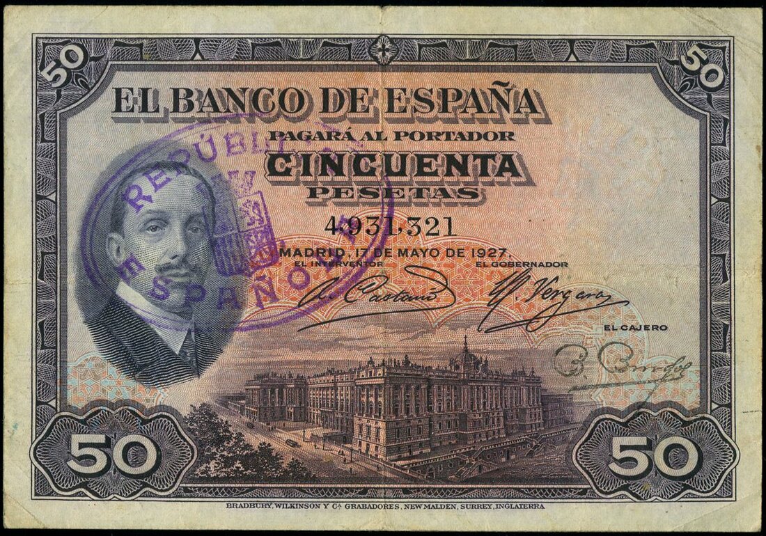 El Banco de Espana, 50 pesetas, 17 May 1927 (1931), serial number 4931321, purple on multicolour underprint, King Alfonso XIII at left, Royal palace in Madrid at low centre, purple Republic Validation at upper left corner