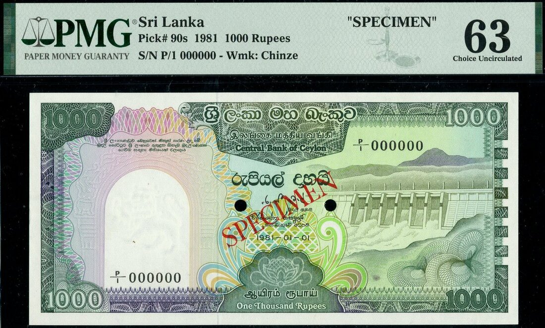 Central Bank of Ceylon, specimen 1000 rupees, 1981, serial number P/1 000000, green and multicoloured, dam at right, reverse peacock, mountains and spillway