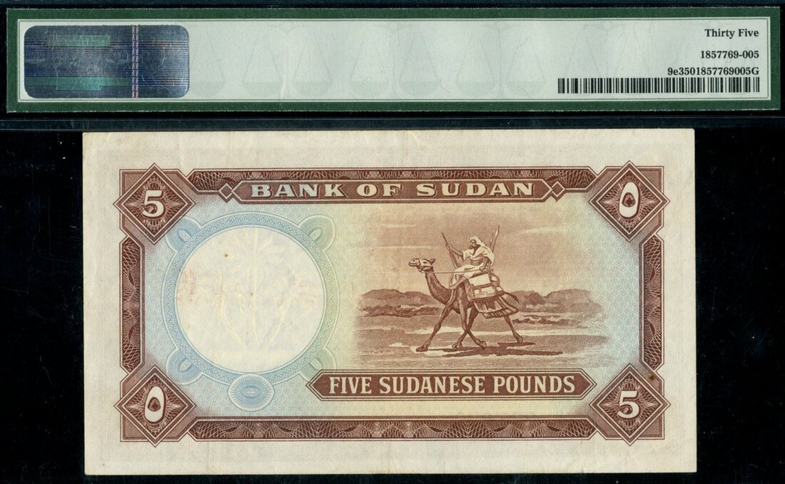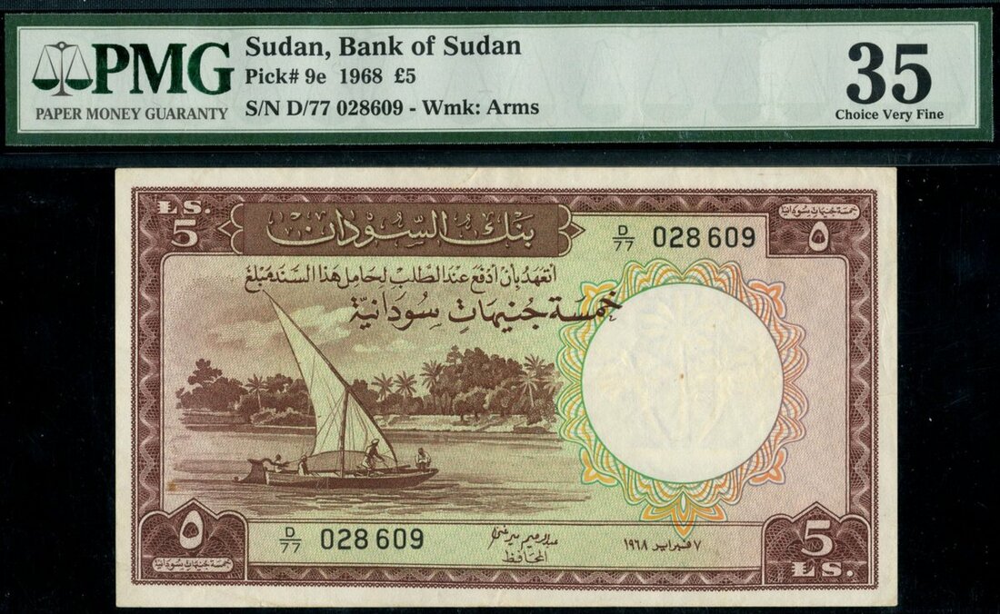 (x) Bank of Sudan, 5 pounds, 1968, serial number D/77 028609, brown, four men in dhow and left, reverse, camle postman,