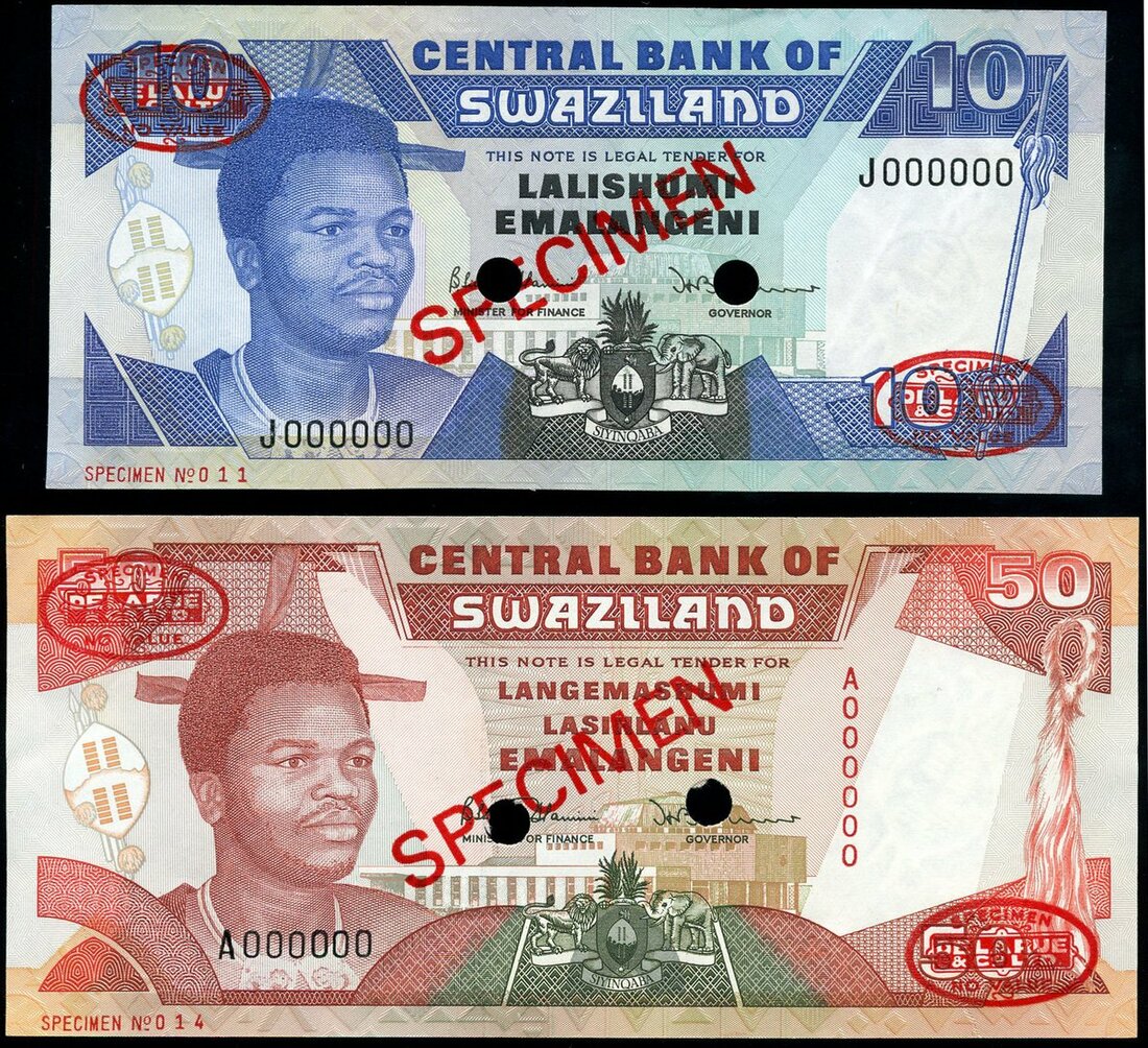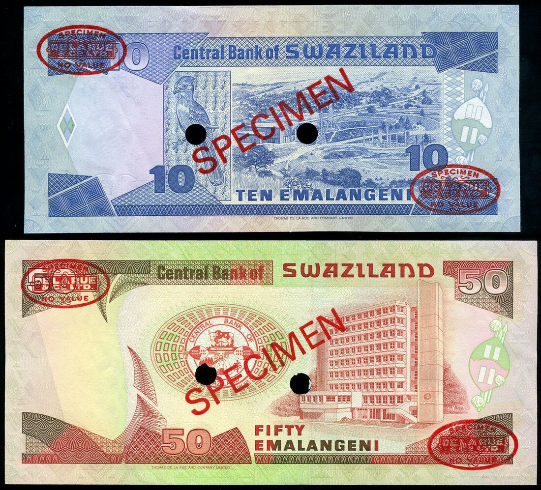 (x) Central Bank of Swaziland, specimen 10, 20 emalangeni, ND (1990-95), (Pick 20s, 21, TBB B215s, B216s), about uncirculated (2 notes)