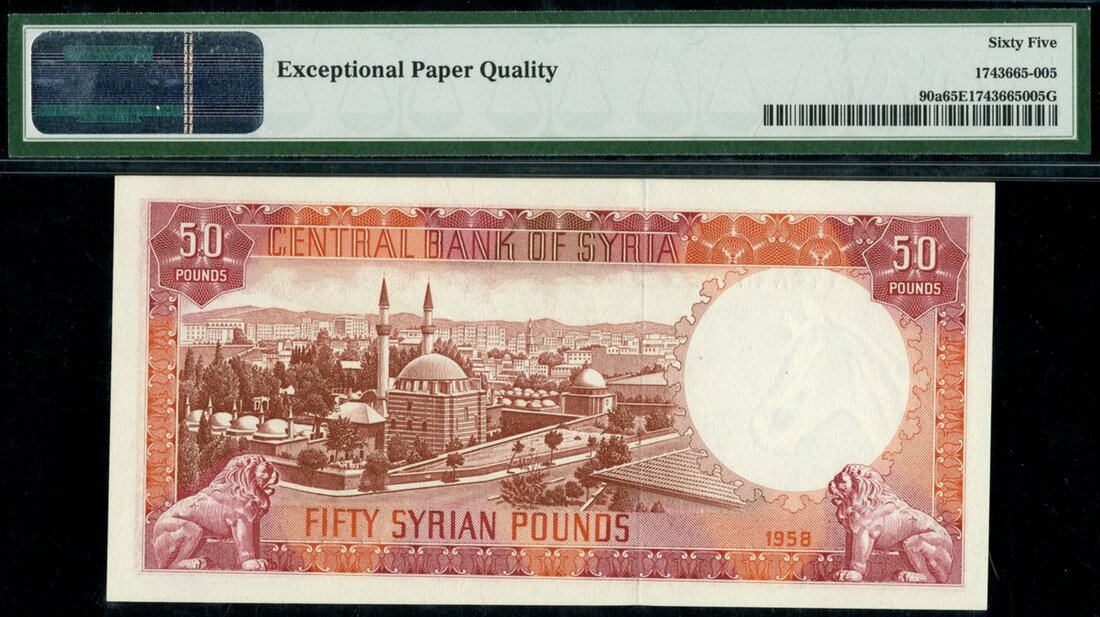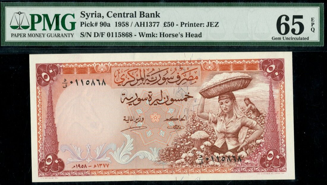 (x) Central Bank of Syria, 50 Syrian pounds, 1958, serial number D/F 0115868, (Pick 90a, TBB B609a), in PMG holder 65 EPQ Gem Uncirculated