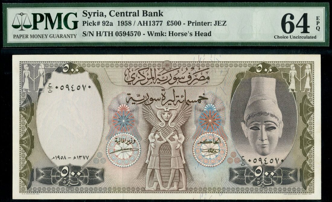 (x) Central Bank of Syria, 500 pounds, 1958, serial number H/TH 0594570, (Pick 92a, TBB B611a), in PMG holder 64 EPQ Choice Uncirculated