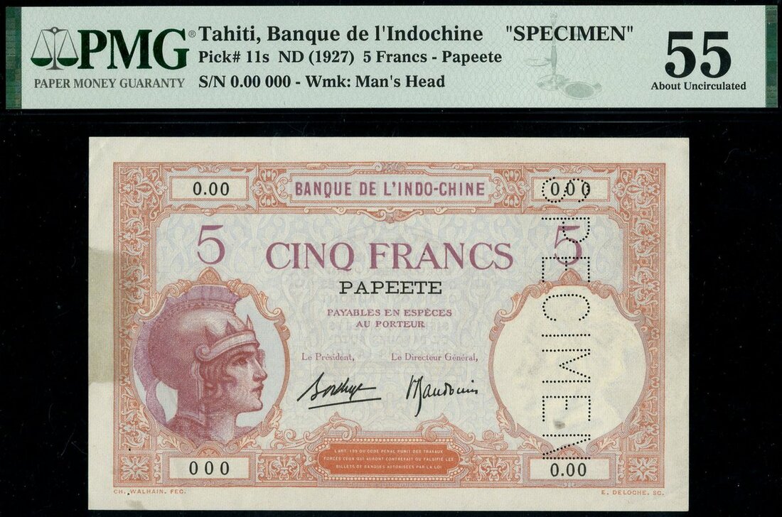 Banque de l'Indochine, Tahiti, specimen 5 francs, ND (c1927), serial number 0.00 000, brown on light green underprint, helmeted female head at low left, value at upper left and right, PAPEETE in text at centre, reverse text, value at low right