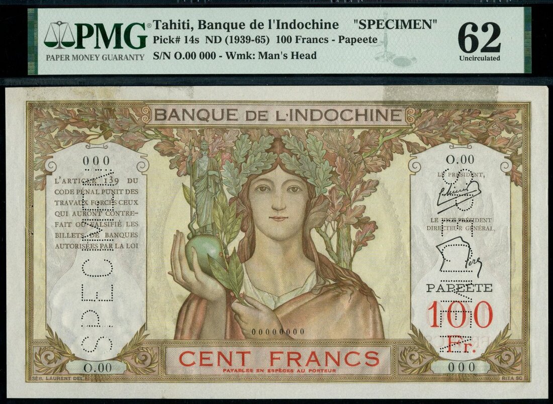 Banque de l'Indo-Chine, specimen 100 francs, ND (1956), serial number O.00-000, brown and green, maiden at centre with statuette of Athena, red value in field, signatures of Minost and Flers, reverse pale green, statue