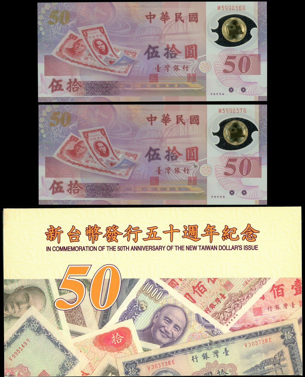 (x) Bank of Taiwan, consecutive 50 yuan (2), '1999 New Yuan Commemorative Issues, serial numbers M399036G, M399037G, (Pick 1990, TBB B392), as issued in original presentation folders (2 notes)