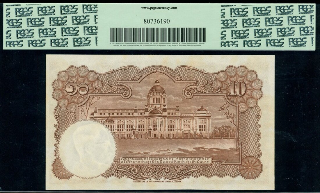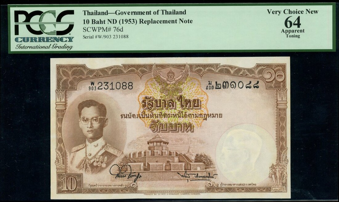 Government of Thailand, replacement 10 baht, ND (1953), serial number W/903 231088, brown on multicolour underprint, Portrait of King in Field Marshal's uniform with collar insignia and three decorations,