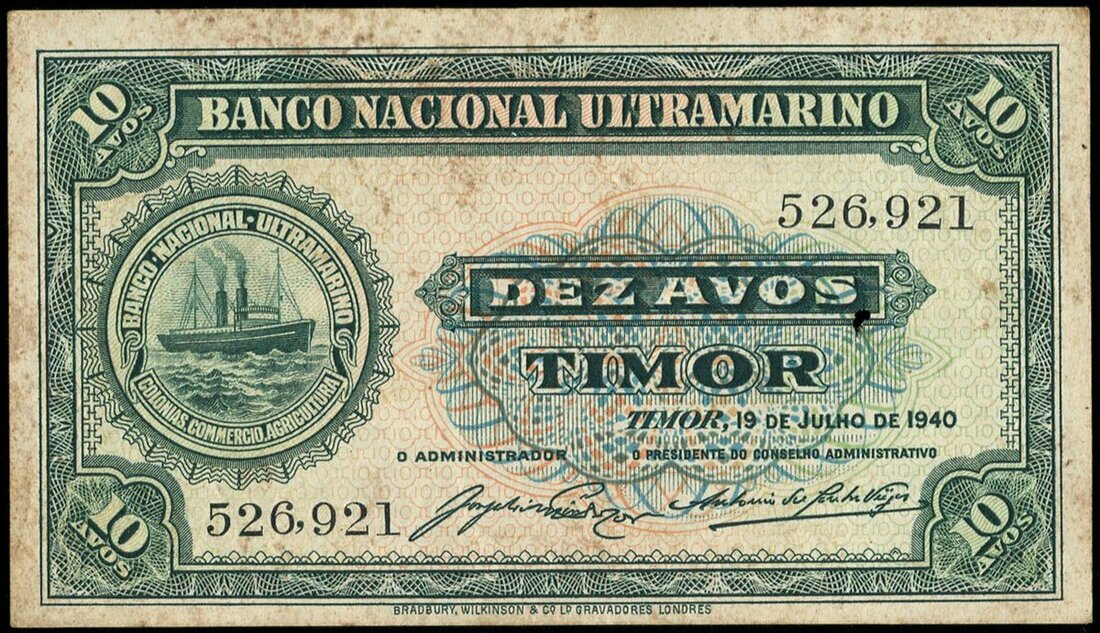 (x) Banco Nacional Ultramarino, Timor, 10 avos, 1940, serial number 526924, green, BNU seal at left,