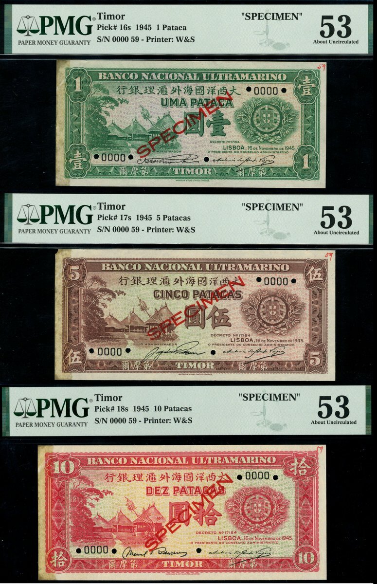 Banco Nacional Ultramarino, Timor, a group of specimens of the 1945 issue and comprising 1 pataca, green, 5 patacas, brown and 10 patacas, red, all arms at right, village and huts at left