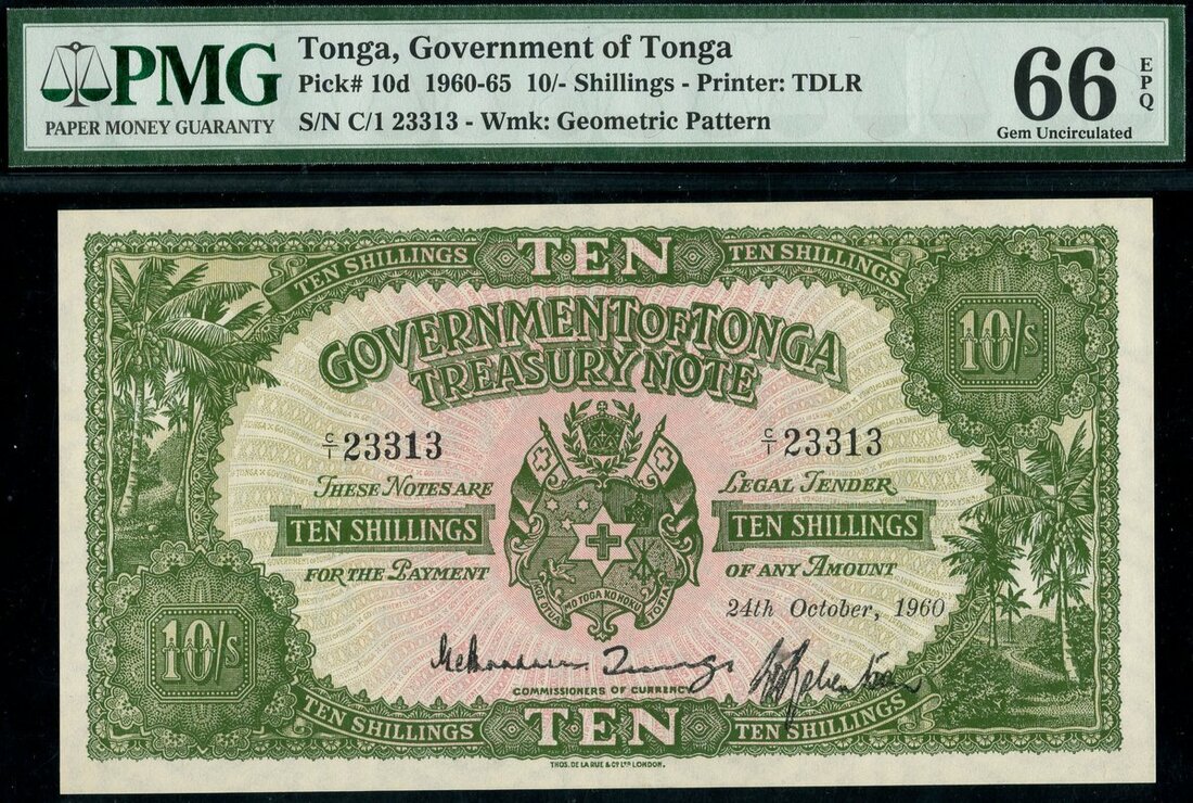 (x) Government of Tonga, 10 shillings, 24 October 1960, serial number C/1 23313, (Pick 10d, TBB B110O), in PMG holder 66 EPQ Gem Uncirculated