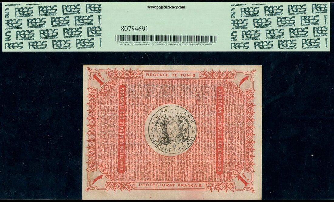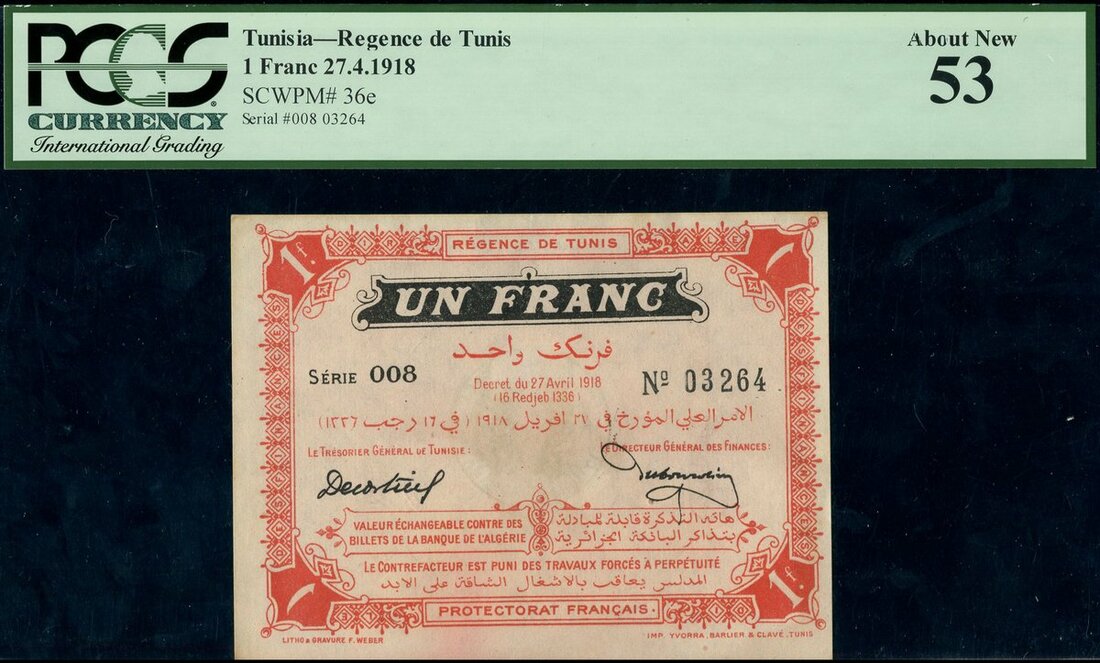 (x) Regnce de Tunis, Tunisia, 1 franc, 27 April 1918, serial number 03264, (Pick 36e), in PCGS Currency holder 53 About New