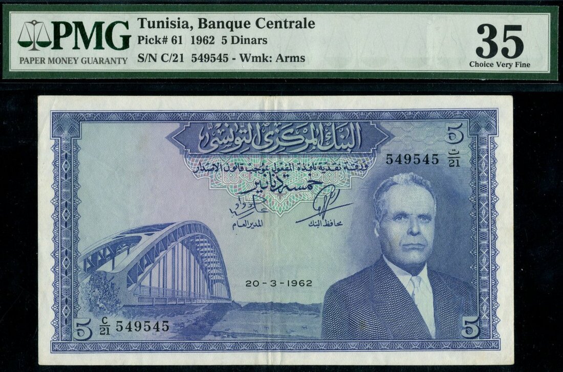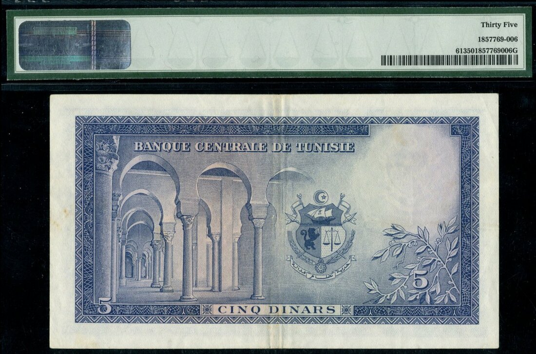 (x) Banque Centrale de Tunisie, 5 dinars, 1962, serial number C/21 54945, (Pick 61, TBB B505), in PMG holder 35 Very Fine