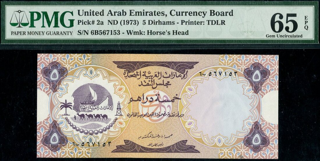 (x) United Arab Emirates Currency Board, 5 dirhams, ND (1973), serial number 6B567153, (Pick 2a, TBB B102), in PMG holder 65 EPQ Gem Uncirculated