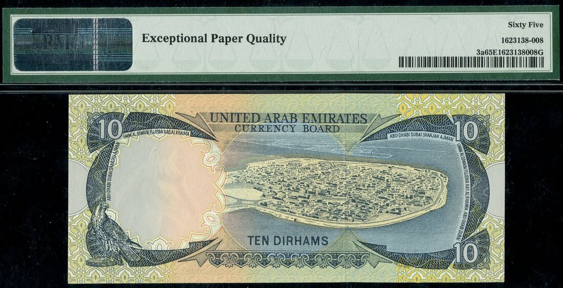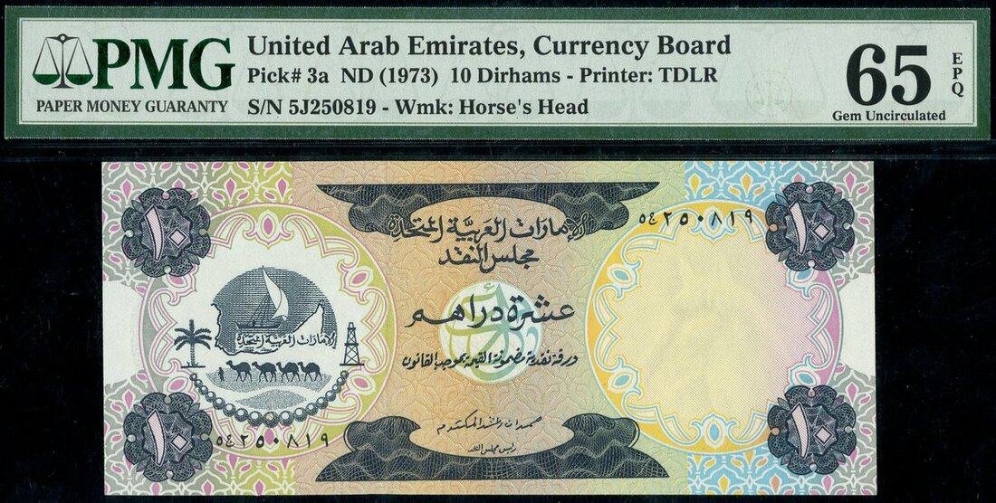 (x) United Arab Emirates Currency Board, 10 dirhams, ND (1973), serial number 5J250819, (Pick 3a, TBB B103), in PMG holder 65 EPQ Gem Uncirculated