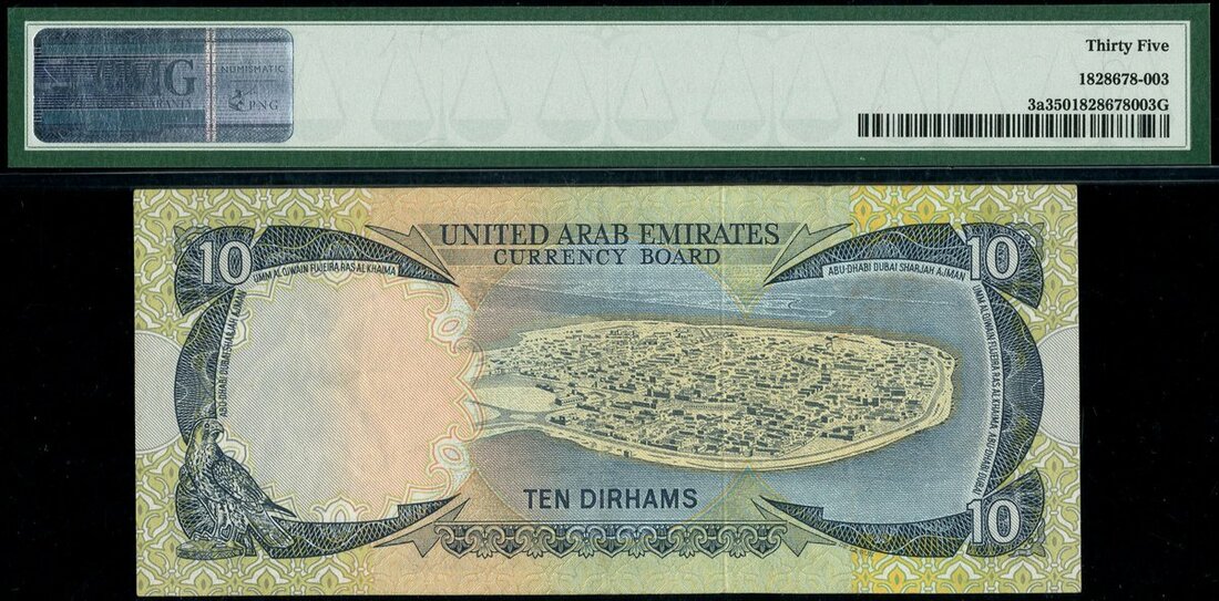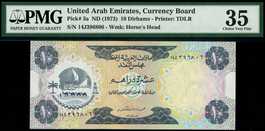 United Arab Emirates Currency Board, 10 Dirhams, ND (1973), serial number 14J 396806, dark blue on multicolour underprint, dhow and symbols of the Arabian desert at left, reverse, aerial view of Umm al-Qaiwan at centre-right, Arabian horse watermark