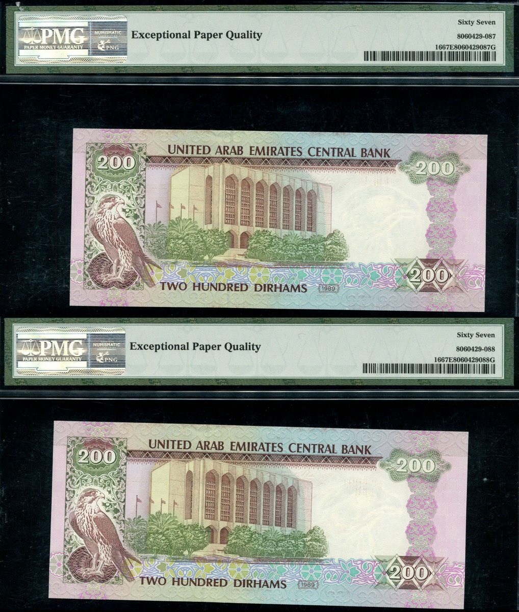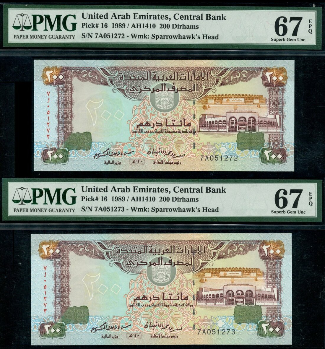 (x) United Arab Emirates Central Bank, consecutive 200 dirhams (2), 1989, serial number 7A051272/273, brown, arms at centre, buildings and landmarks at right, reverse, sparrow-hawk at left, Central Bank headquarters at centre,