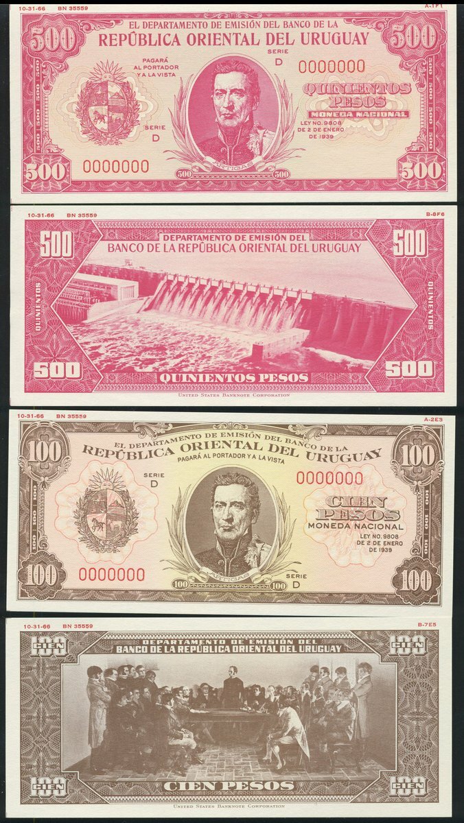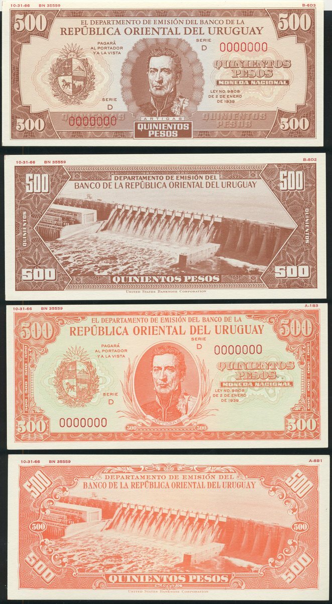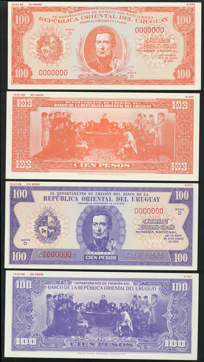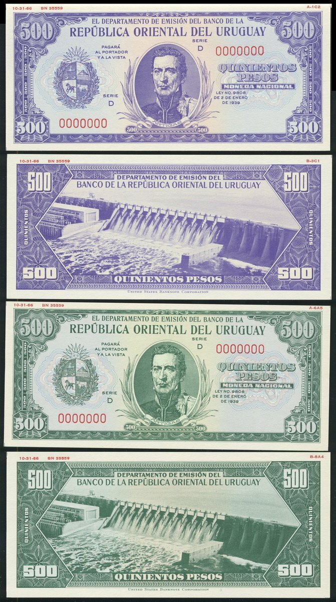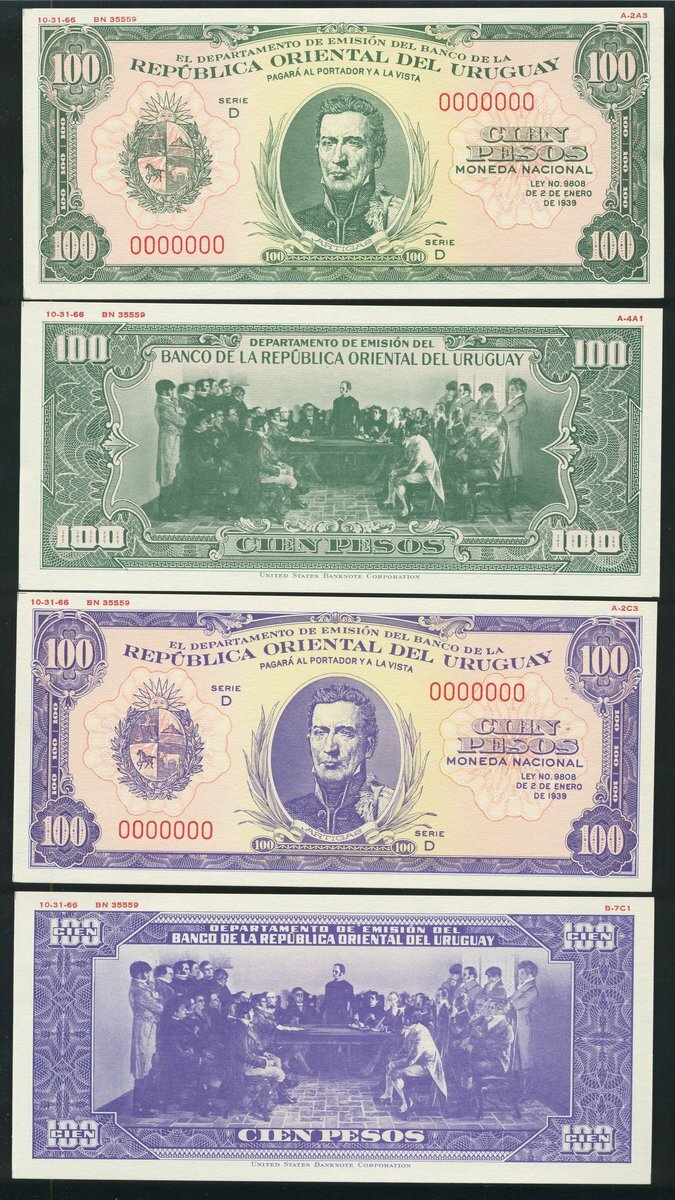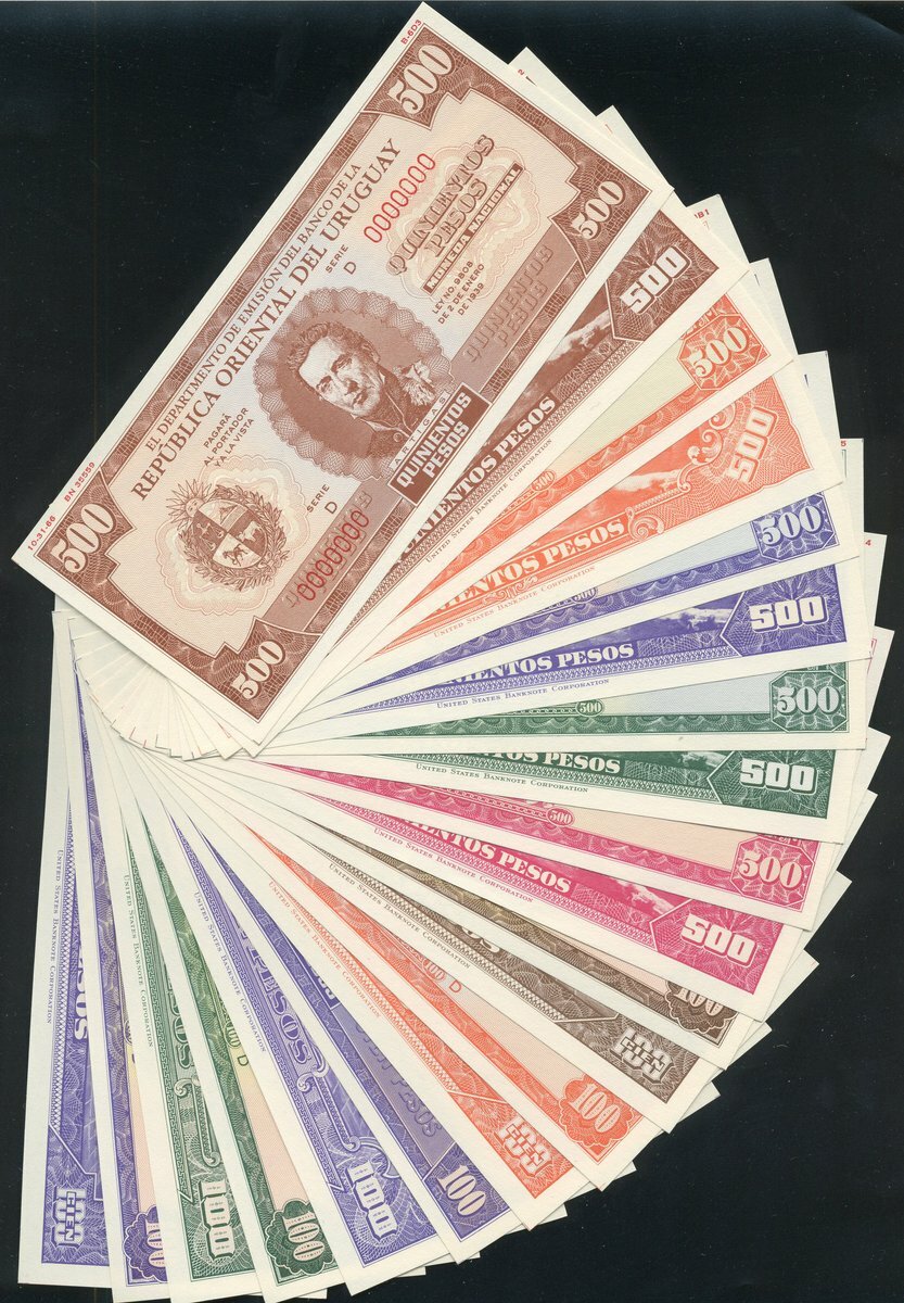 (x) Republica Oriental del Uruguay, a group of proofs with colour bars for the issue of 1939 comprising obverse and reverse 100 pesos ( 4 pairs), one in violet, one green, one brown and one red, 500 pesos (6 pairs), one orange, one blue, one grey-brown, one brown, one pink and one green, all Artigas at centre