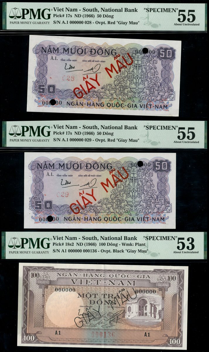 (Pick 17s, 18s, TBB B121as1, 116as1), GIAY MAU overprint, in PMG holders, 50 dong (staple holes) 55 About Uncirculated, 100 dong (thinning) 53 About Uncirculated