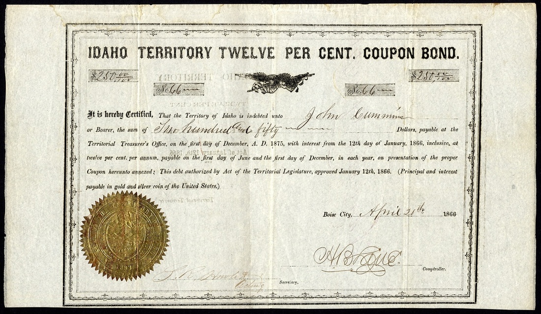 Idaho Territory, 12% Loan, 1866, bond for $[250], #66, black printing, gold seal. AVF and rare.