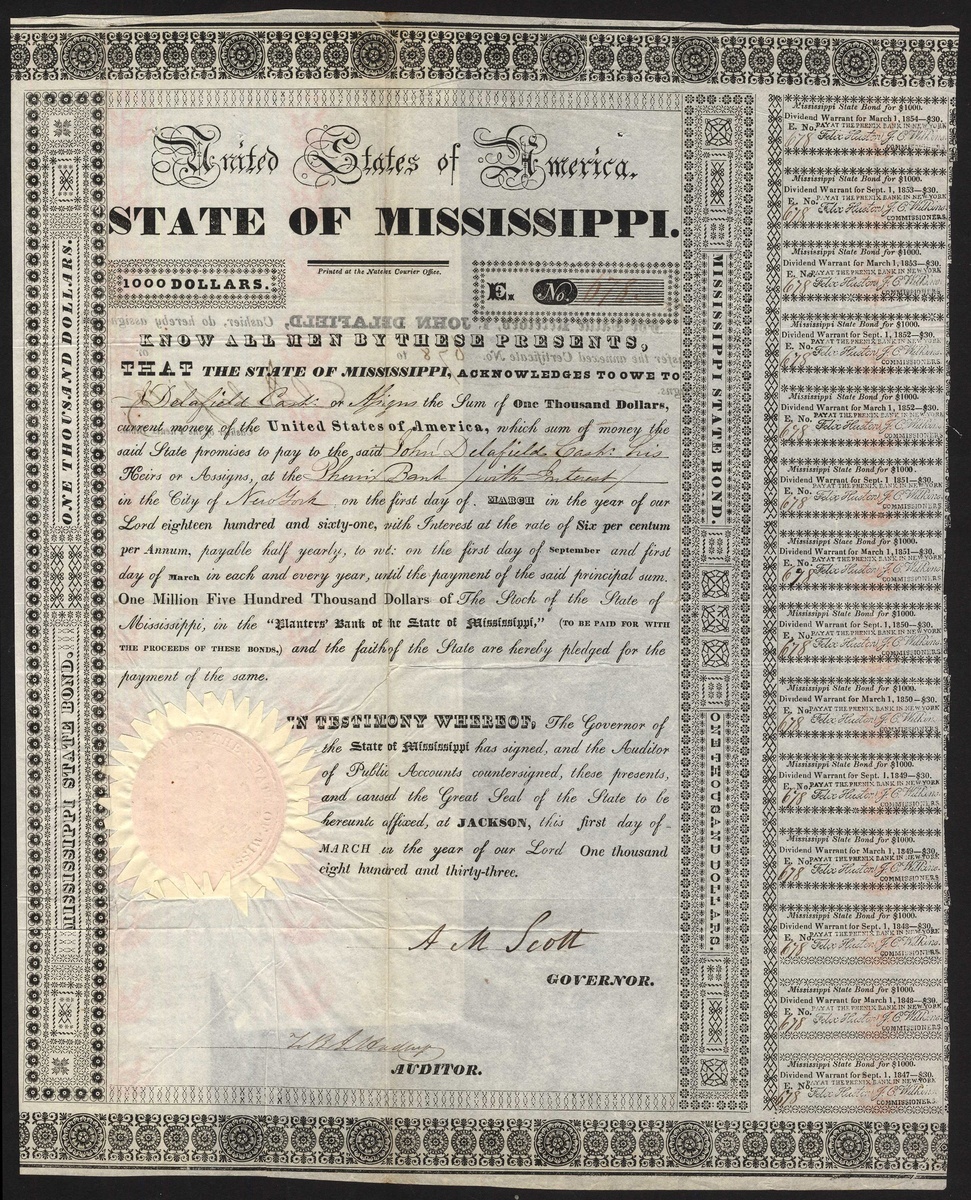 State of Mississippi, 6% 'Planters' Bank' Loan, 1833, bond for $1000, series E, redeemable 1861, #678, signed by the Governor, A.M.Scott, attractive engine turned borders, black, with coupons, also with coupon sheet for obtaining interest payments in London. VF.