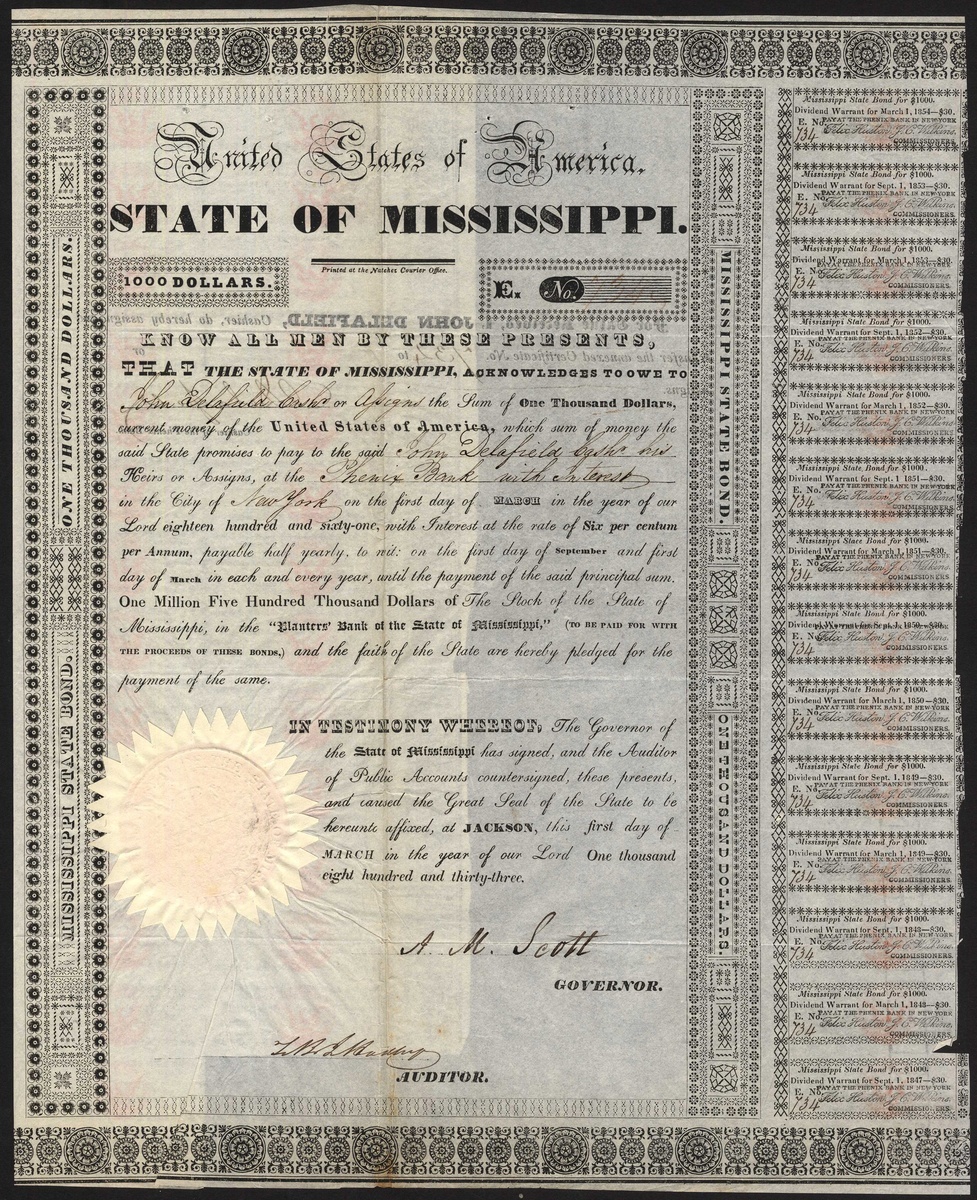State of Mississippi, 6% 'Planters' Bank' Loan, 1833, bond for $1000, series E, redeemable 1861, #734, signed by the Governor, A.M.Scott, attractive engine turned borders, black, with coupons, also with coupon sheet for obtaining interest payments in London. VF.