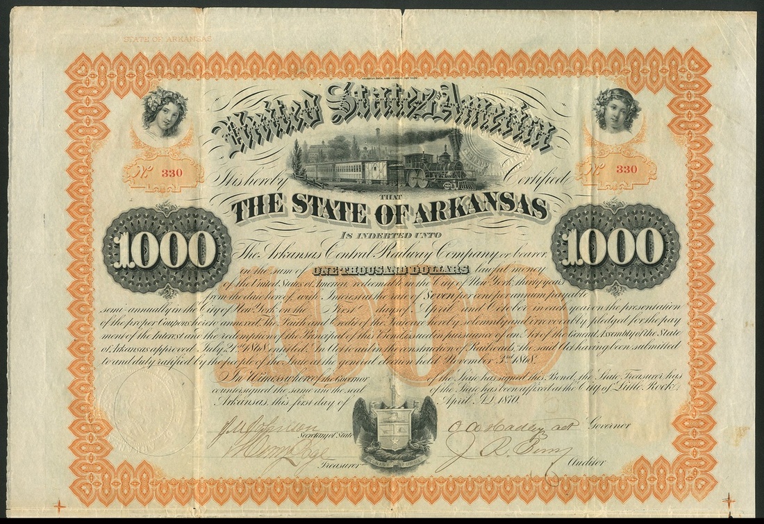 State of Arkansas, 7% Loan, 1870, in aid of the Arkansas Central Railway, $1000, #330, steam train in centre, state arms below, orange and black, printed by ABNCo., with coupons. AVF.