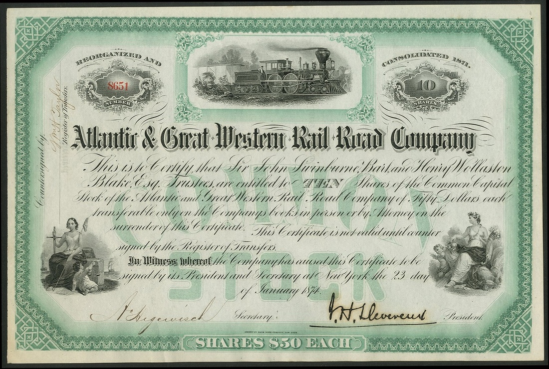 Atlantic & Great Western Rail Road Company, 10 shares of $50, 1874, #8651, signed by J. H. Devereaux as President, steam engine at top, allegorical figures below, green and black. John H. Devereaux, 1832-1886, civil engineer and railroad manager. Union Colonel, rising to General during the Civil War in charge of railroads in Virginia. President of several railroads in Cleveland including Lake Shore & Michigan Southern and Cleveland, Columbus, Cincinnati & Indianapolis Railroad. He built a house in Euclid Avenue (Millionaires Row) whose residents included John D. Rockefeller until 1884. EF.