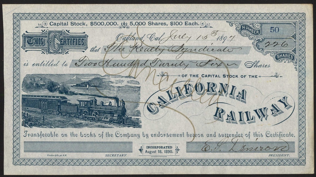 California Railway (CA), $100 shares, 189[7], #50, not signed by the secretary, steam train at left, blue printing, cancelled across face, GVF.