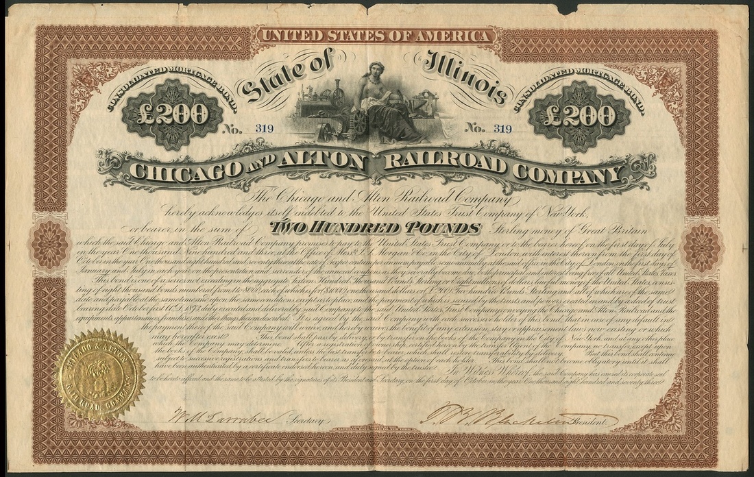Chicago and Alton Railroad Company, Consolidated Mortgage bond, 1873, £200, #319, allegorical figure at top, brown and black, with coupons. Some chipping at top edge otherwise VF.