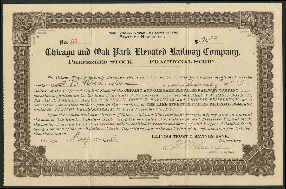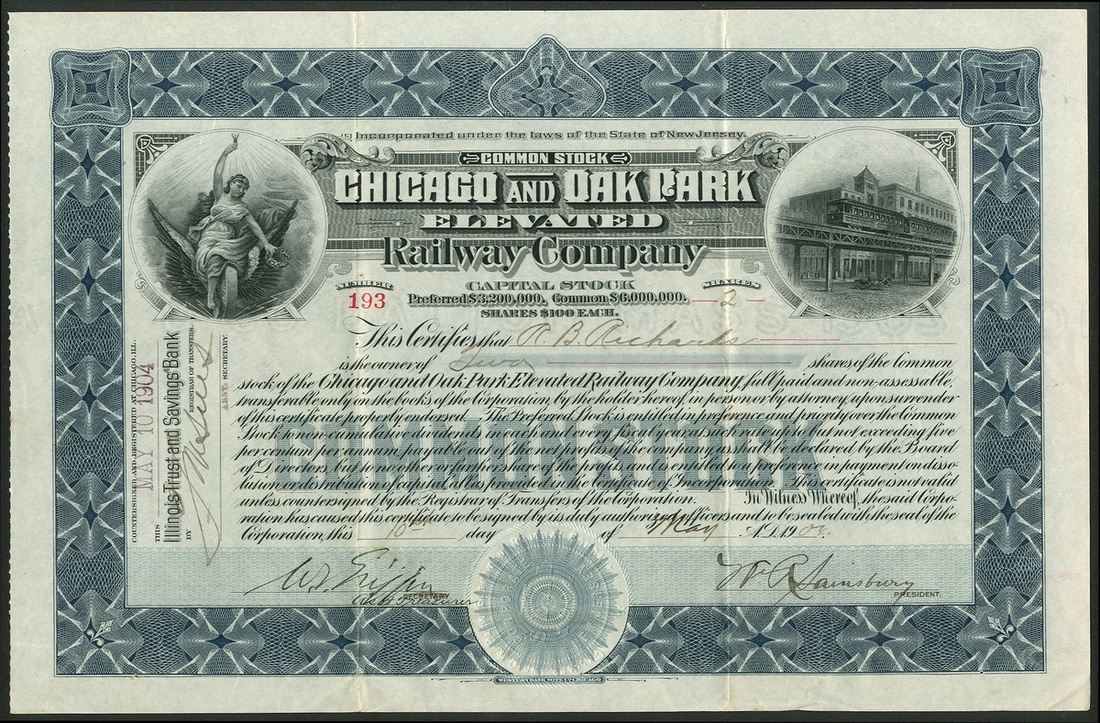 Chicago and Oak Park Elevated Railway Company, New Jersey, common stock certificate, 19[04], #193, elevated railway to right, allegorical figure left, slate blue and black, together with a fractional scrip certificate for preferred stock, 190[4], #56, brown. Both VF (2).