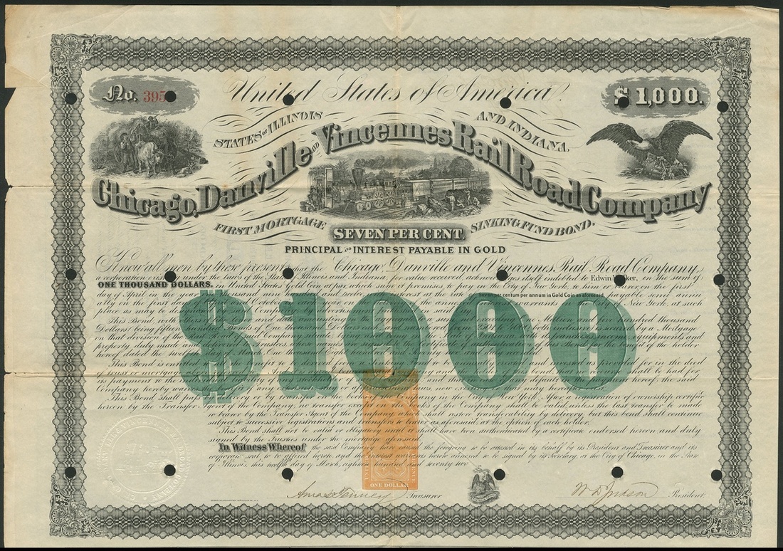 Chicago, Danville and Vincennes Rail Road Co., (IL), 7% first mortgage sinking fund bond for $1000, 1869, #3959, steam train at station below title, farmers top left, American eagle top right, black with green underprint, with coupons, hole cancelled. Splits at left edge otherwise VF.