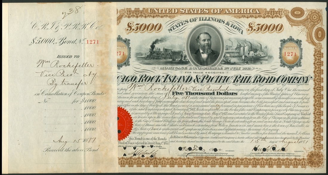 Chicago, Rock Island & Pacific Rail Roal Company, Mortgage Bond for $5000, 18[81], #1271, vignette with train, president J.F. Tracy and harbour, issued to and signed on the reverse by William Avery Rockefeller (1841-1922) as "Vice President". Co-founder of Standard Oil with his brother John D. Rockefeller. Reglued to stub, hole cancelled. GVF.