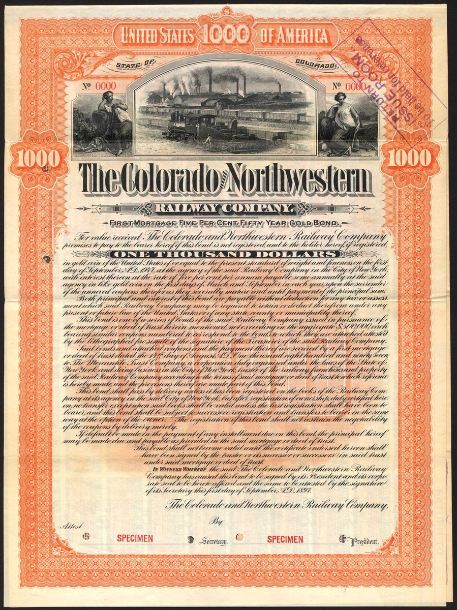 Colorado and Northwestern Railway Co. (CO), first mortgage 5% 50yr gold bond for $1000, a specimen certificate from the ABNCo archives, 1897, locomotive with freight cars and factories behind at top, ornate border, orange and black, numbered 0000, overprinted SPECIMEN in signature area. Small edge tear on fold at left, VF.