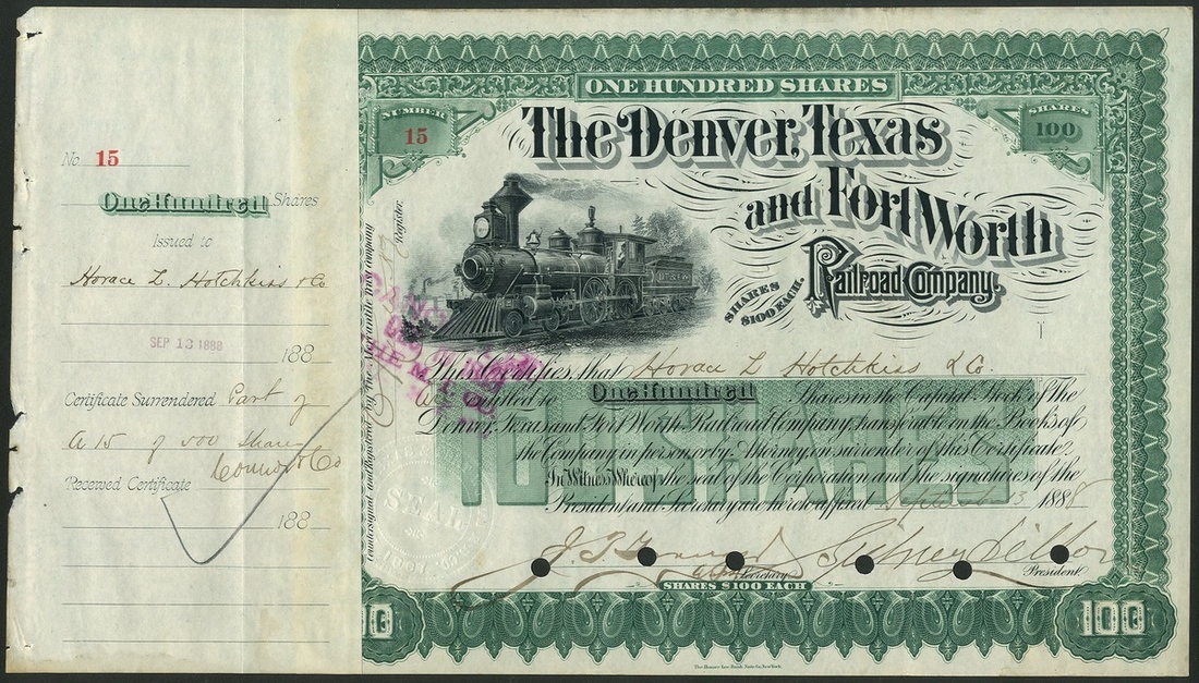 Denver, Texas and Fort Worth Railroad Company, 100 shares of $100, 188[8], #15, signed by Sidney Dillon as President, steam train left, green and black, cancelled with counterfoil reglued at left. Sidney Dillon (1812-1892) constructed numerous US railroads and was one of the principal contractors for the Union Pacific. He took part in the laying of the last rail of the First Transcontinental Railroad in 1869, receiving one of the ceremonial silver spikes used to complete the project. He was involved in the Crédit Mobilier of America scandal. For many years, he was President of the Union Pacific Railroad and an important business partner of Jay Gould. GVF.