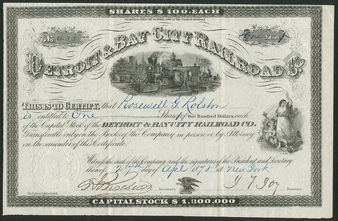 Detroit & Bay City Railroad Co., $100 shares, 18[78], #433, signed by James Frederick Joy as President, steam train at station, black, NOT cancelled. James Frederick Joy, 1810-1896, railroad magnate and politician, President of the Michigan Central Railroad, organiser of the Chicago, Burlington & Quincy Railroad and president of many smaller lines in Michigan. A friend of Abraham Lincoln and a representative in the Michigan Legislature in 1861. GVF and scarce.