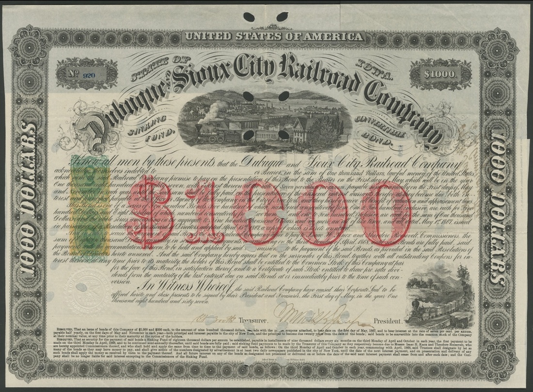 Dubuque and Sioux City Railroad Co., sinking fund convertible bond, $1000, 1867, #920, signed by Morris K. Jesup as President, steam train passes large house, further vignette at bottom right, black, red underprint '$1000', impressed revenue stamps, with coupons. Hole cancellations, 2 of which pass through signature, GVF.