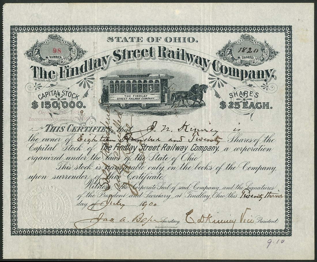 Findlay Street Railway Company, Ohio, certificate for [1820] $25 shares, 18[1900], #98, issued to J. N. Kinney and signed on the reverse by vice President C. D. Kinney as his attorney, attractive horse drawn tram in centre, black, neat hand cancellation. This certificate represents nearly one third of the capital. VF.