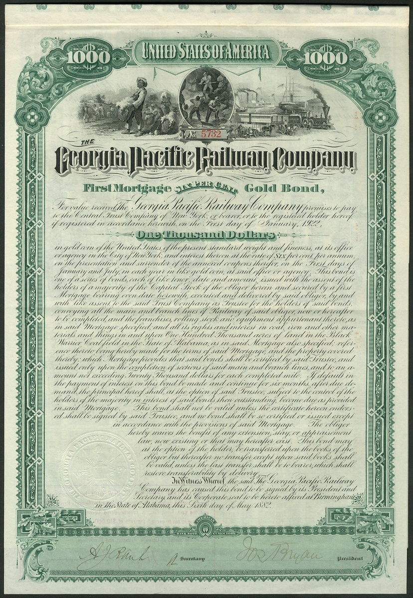 Georgia Pacific Railway Company, First Mortgage 6% Gold Bond, $1000, 1882, attractive piece with 3 vignettes of steam train at dockside, cotton picking and miners at work, green and black, ABNCo., with coupons. EF.