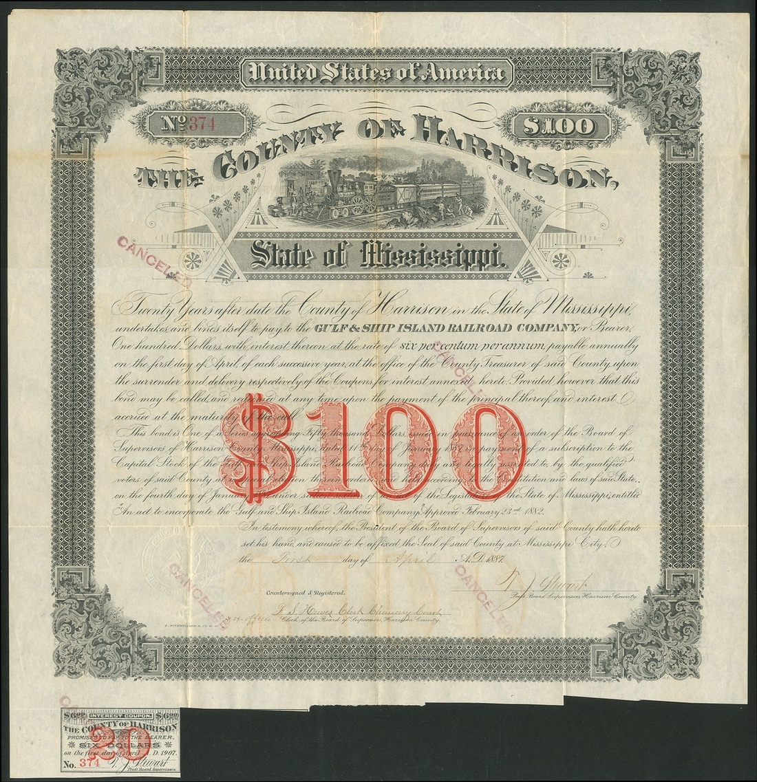 Gulf and Ship Island Railroad Company, 6% bond for $100 issued by the County of Harrison, Mississippi in aid of the railroad, 1887, #374, large format piece with steam train and railroad workers at top, black, with red '$100' underprint, with coupons. Cancelled. VF and scarce.
