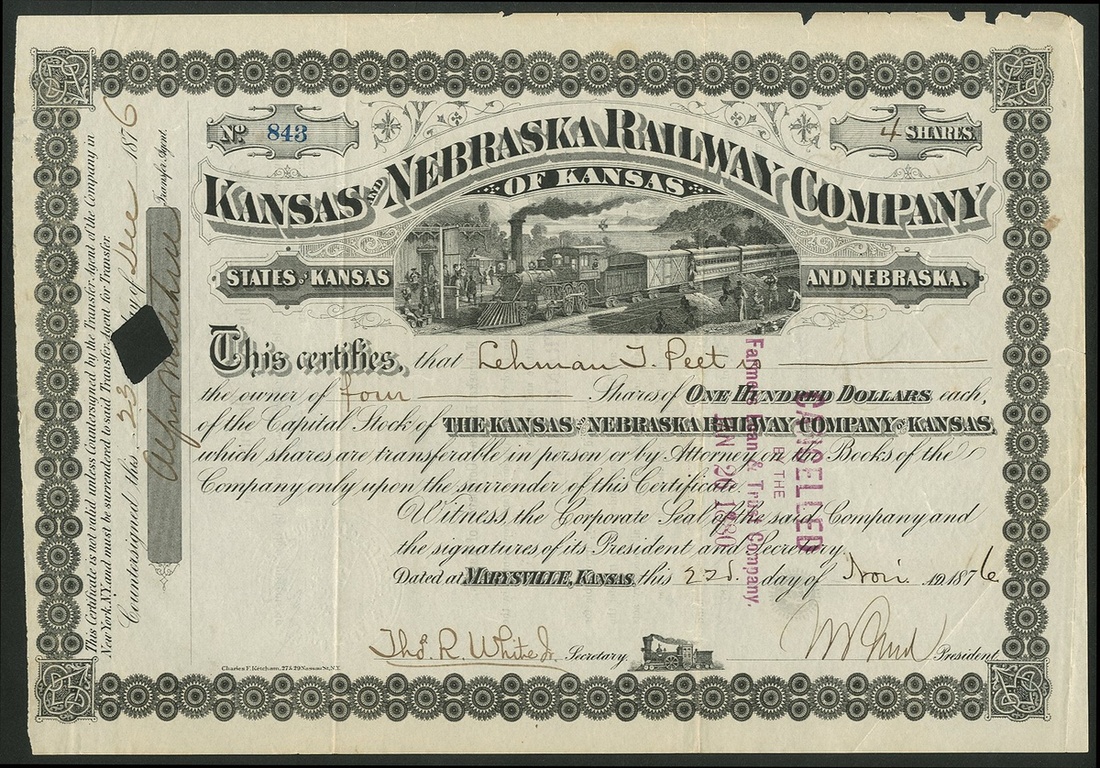Kansas and Nebraska Railway Company, $100 shares, Marysville 187[6], #843, steam train in centre, black, cancelled. Chipped top edge otherwise VF.