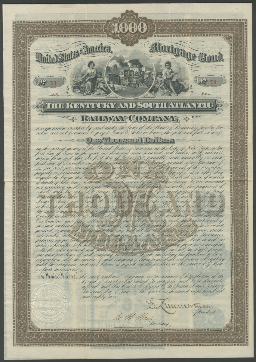Kentucky and South Atlantic Railway Co., Mortgage bond, $1000, 1882, #71, steam train top centre, brown, with all coupons. GVF.