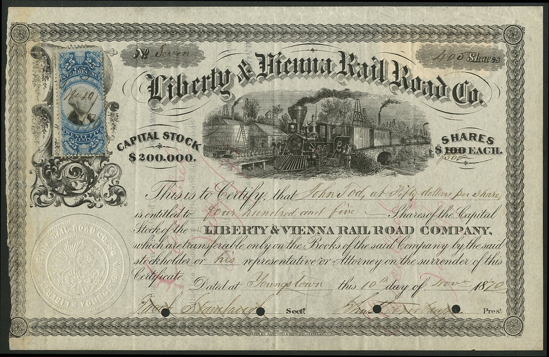 Liberty & Vienna Rail Road Company, $100 (reduced to $50) share, 18[70], #7, steam train in centre, black, blue adhesive revenue stamp, cancelled. Organised in 1868 to serve the numerous coal mines in the region. In 1872 consolidated with the Cleveland and Mahoning and the Niles and New Lisbon railroads to form the Cleveland and Mahoning Valley Railroad Company. Uneven left edge, VF and rare.