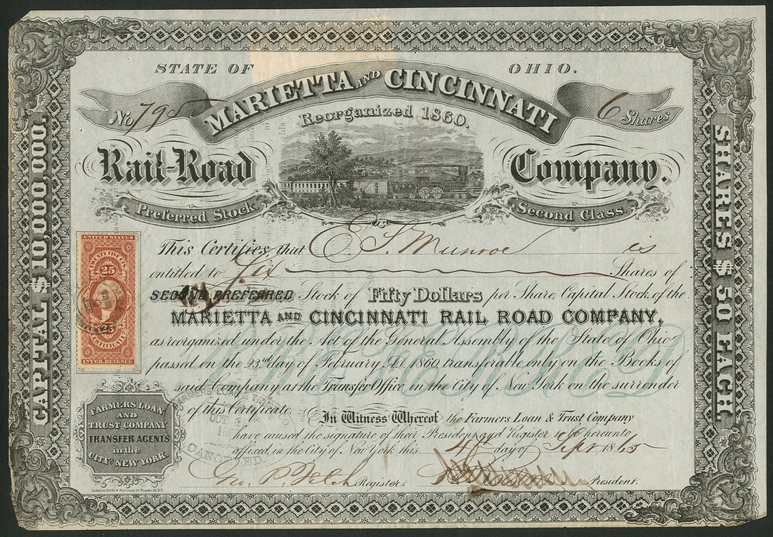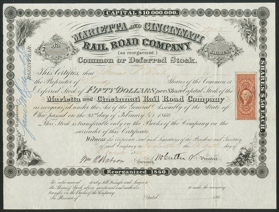 Marietta and Cincinnati Rail Road Co., a group of 3 certificates for 1st Class preferred stock, 18[64], #456, steam train at top, black; 2nd Class preferred stock, 18[65], #795, steam train, black, and Common or Deferred stock, 18[65], #646. The second has chipped corners otherwise all are VF or thereabouts (3).